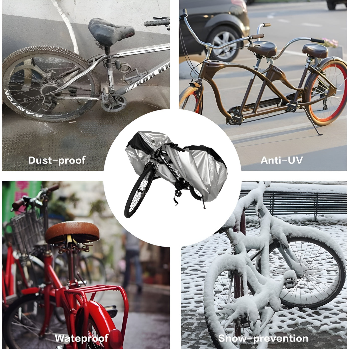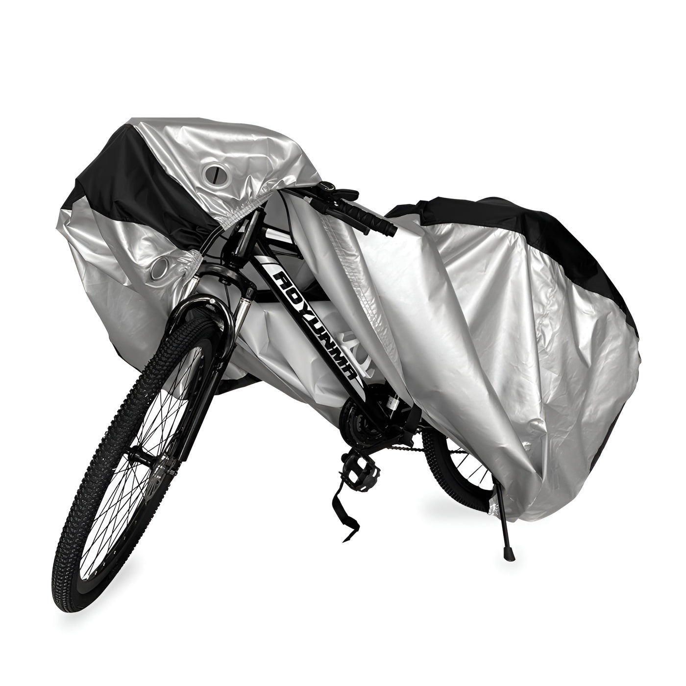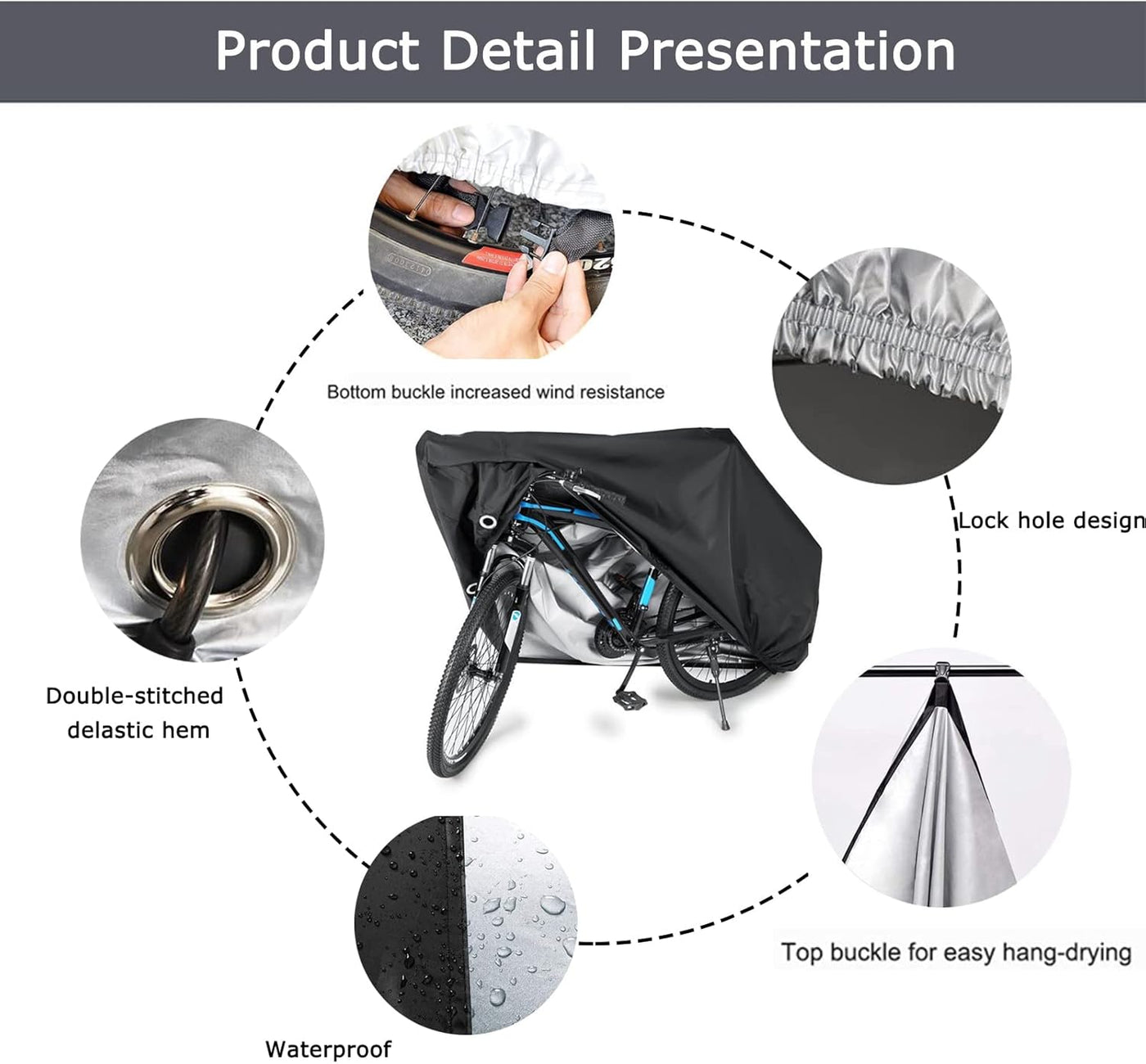 Protect your bike from rain, sun, dust, and dirt with this durable Oxford fabric cover. Coated with PU and UV protection, it helps reduce fading and wear from outdoor exposure. Designed with a front lock hole, elastic hem, and buckle strap, the cover stays secure even in windy conditions. Lightweight and foldable, it fits most bikes up to 29-inch wheels, including mountain bikes, road bikes, cruisers, and mopeds.