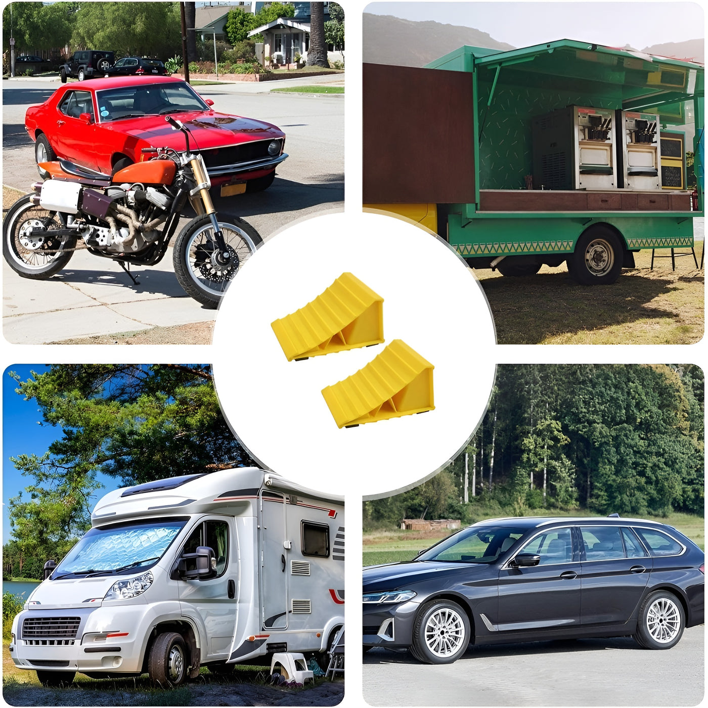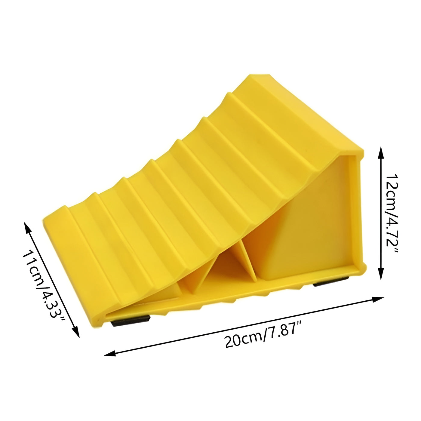 Features:-Build: Strong plastic body with rubber base resists oil, UV rays, and weather wear.-Anti Slip Grip: Sawtooth surface design enhances traction and holds tires securely.-Compact Size: Lightweight and portable, convenient to store in the trunk or toolbox.Universal Compatibility: Suitable for most cars, RVs, and trailers, providing stable support for various tire sizes.-Safe Parking Support: Keeps vehicles steady on uneven or sloped ground for added safety.