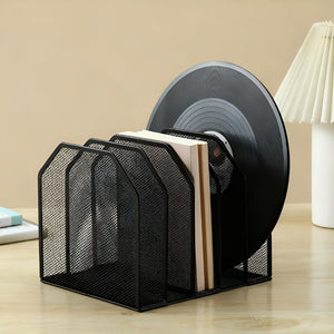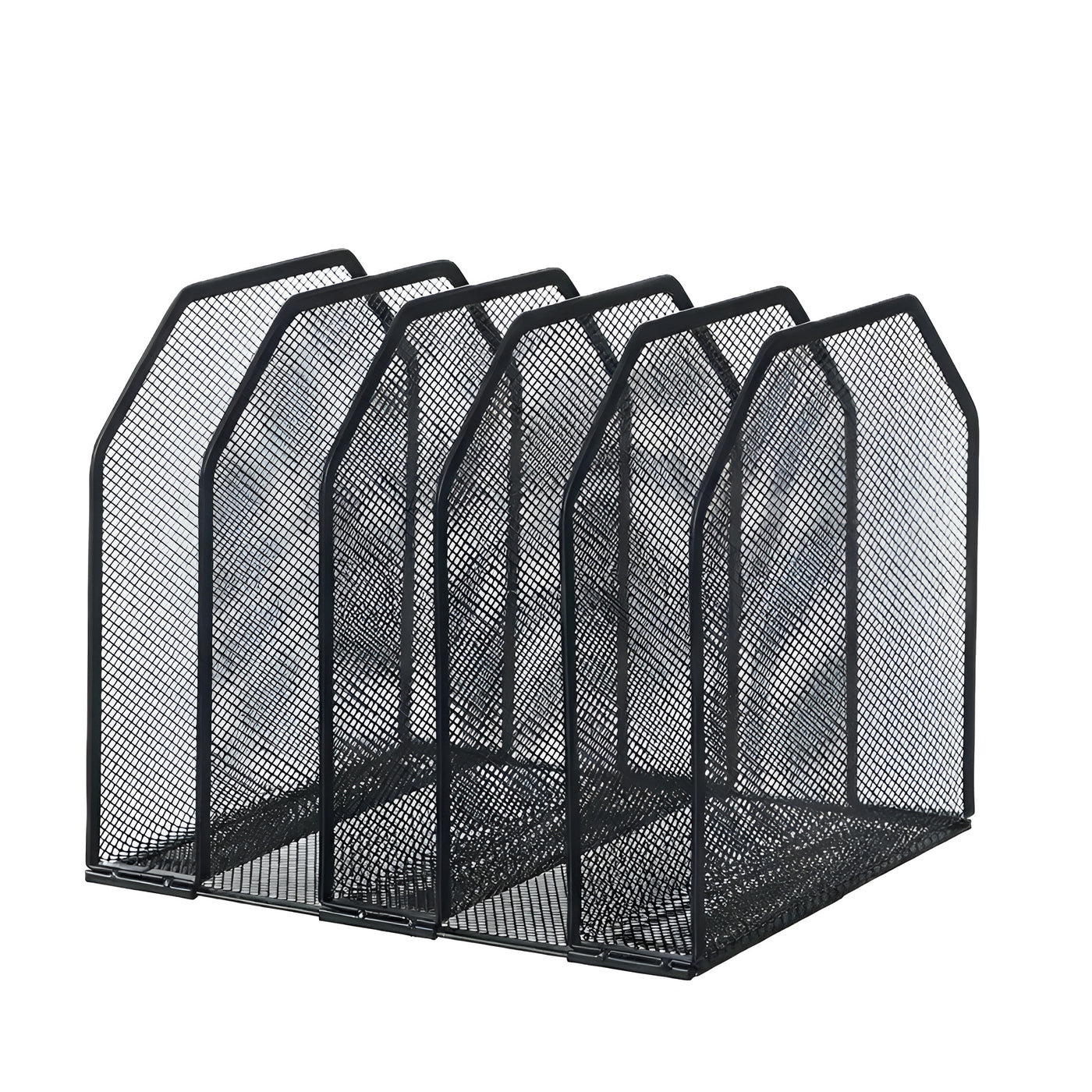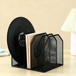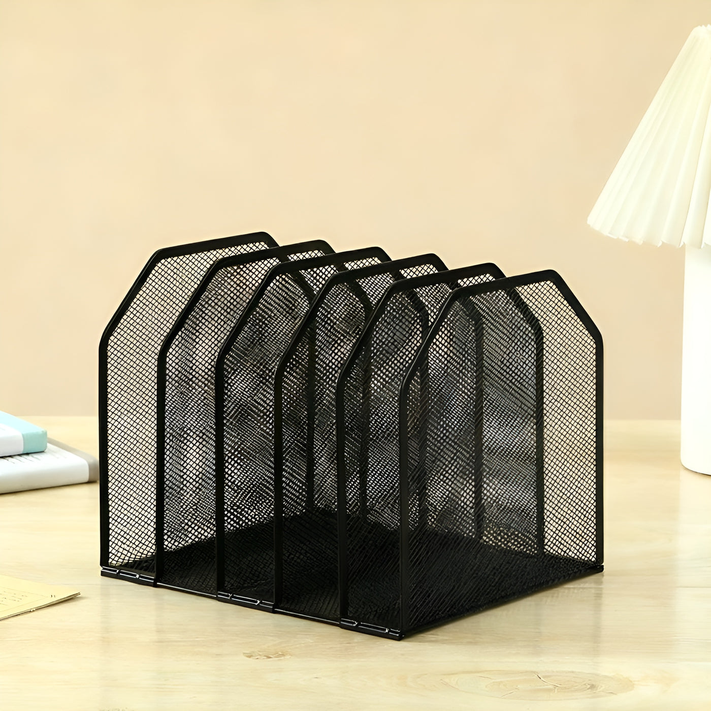 Space-saving metal desk file holder with five compartments for books, documents, and office supplies.The metal desk file organizer keeps your workspace neat and organized. With five spacious compartments, it holds books, documents, papers, magazines, letters, and other office supplies. The compact 24×21.5×20.2 cm fits most desks without taking up too much space. Made of metal with rounded corners, the organizer is both stylish and practical, and easy to assemble for immediate use in offices, homes, or study areas.