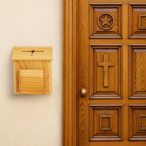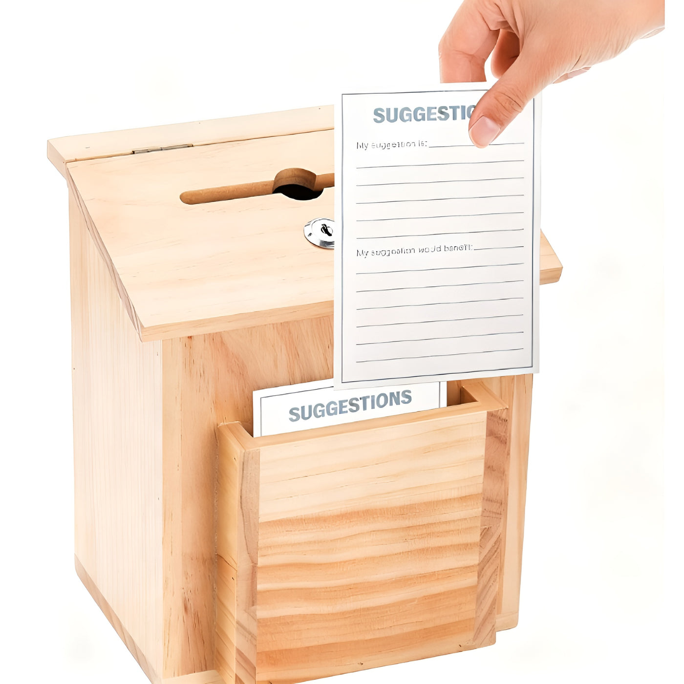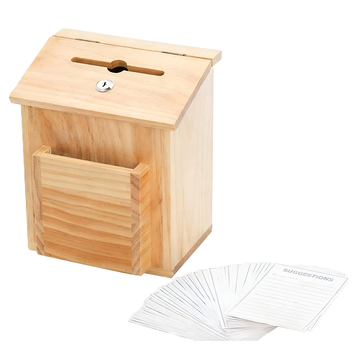 The pine wood suggestion box offers a secure place for votes, comments, donations, and forms. The natural wood texture gives it a clean and professional look. A side card holder keeps blank cards ready for use, and the built-in lock keeps contents protected. Two keys are included for easy access. The box can be placed on a desk or mounted on a wall, making it suitable for offices, schools, events, and community spaces.