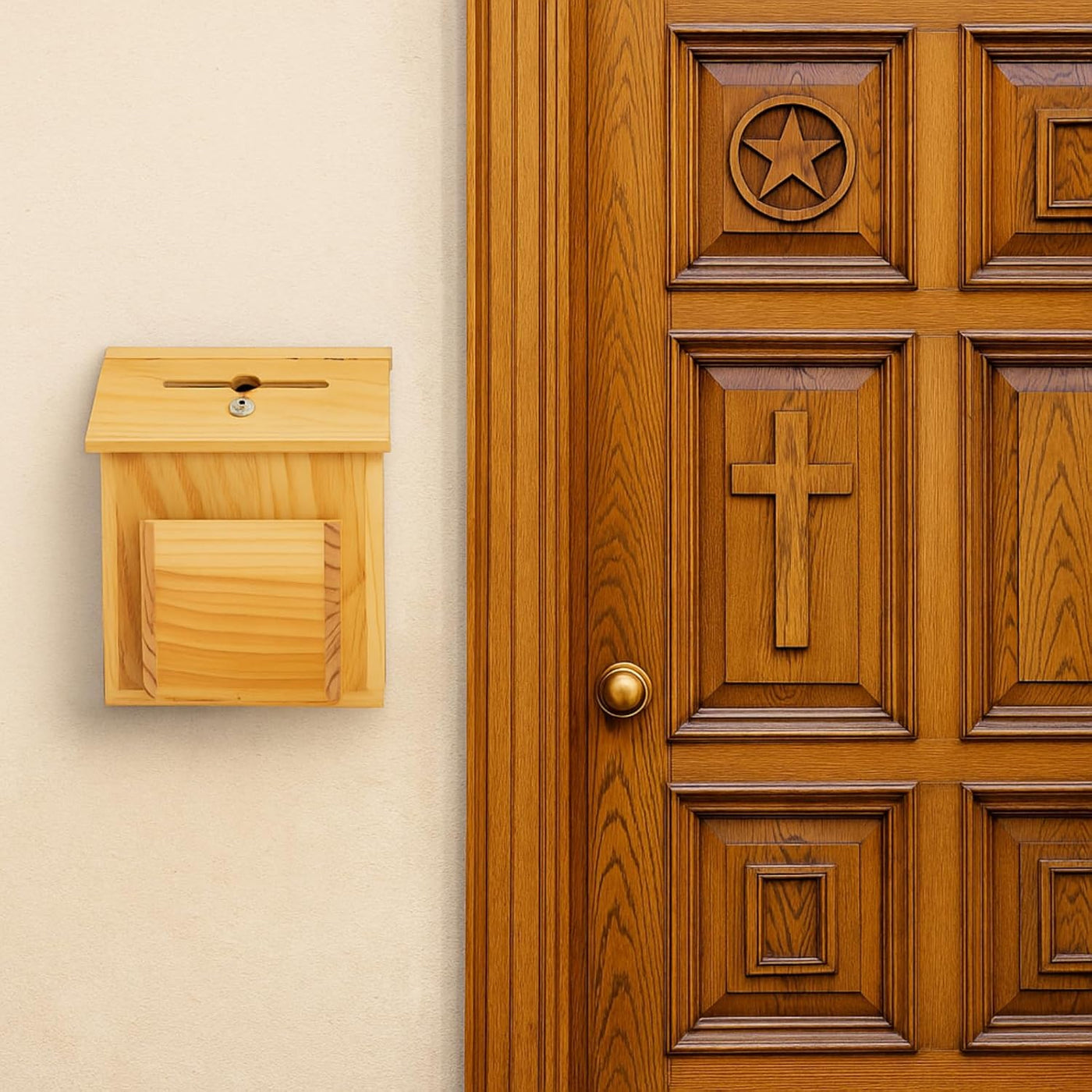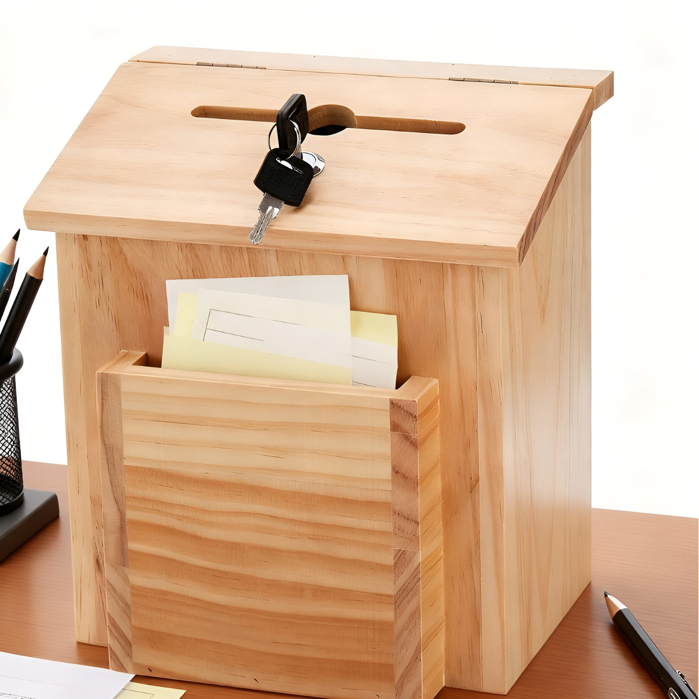 Features:-Pine Wood Build: Strong pine wood with a smooth finish that keeps a natural and neat look suitable for daily use.-Secure Locking: Built-in lock with two keys keeps notes, votes, and donations private and protected.-Side Card Holder: Attached pocket holds blank cards or forms for quick and easy access.-Spacious Interior: Holds comment cards, money, forms, and small items without running out of room.-Flexible Placement: Flat base and wall-mount option fit desks, counters, entry points, and reception areas.