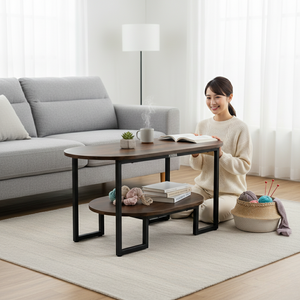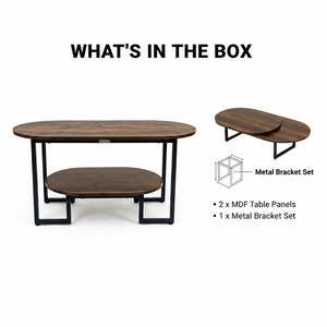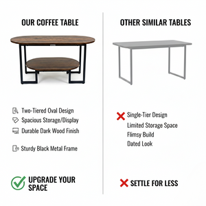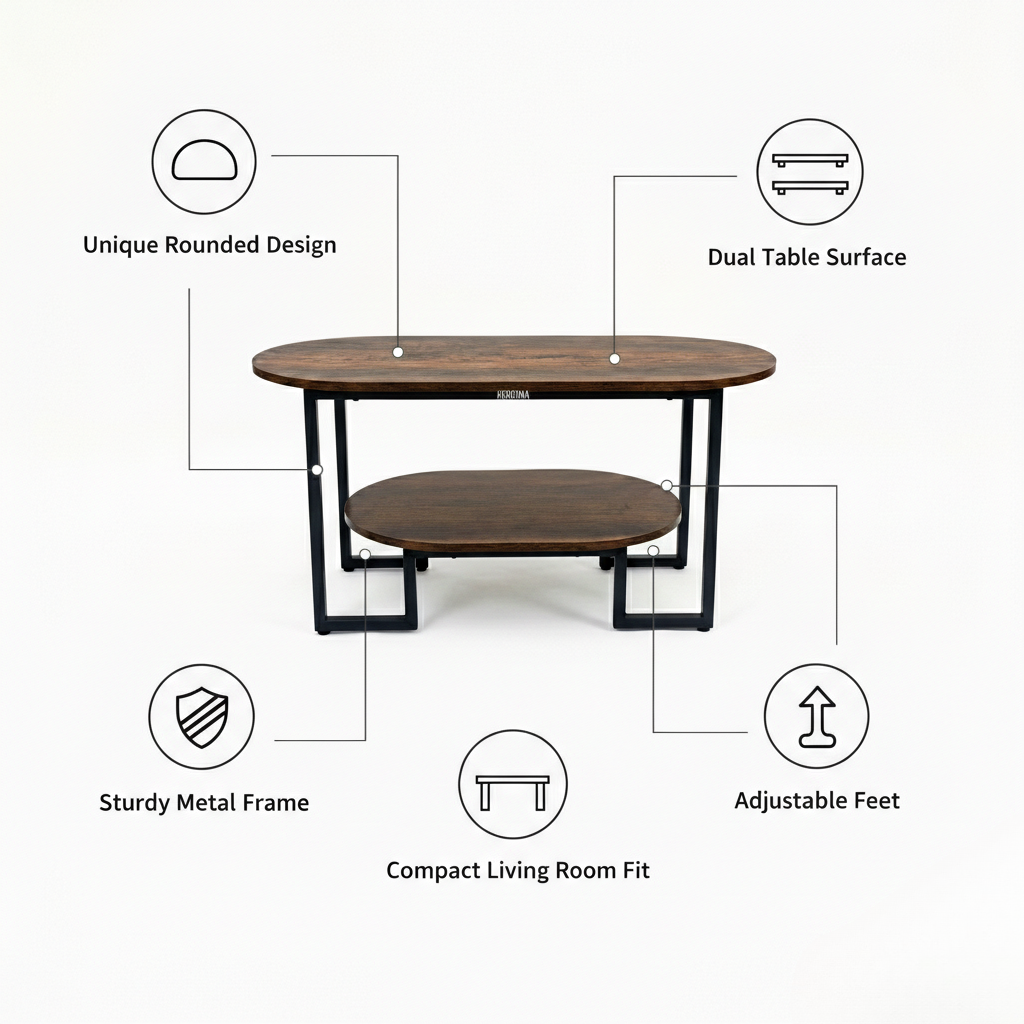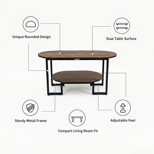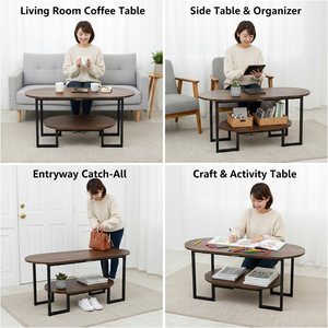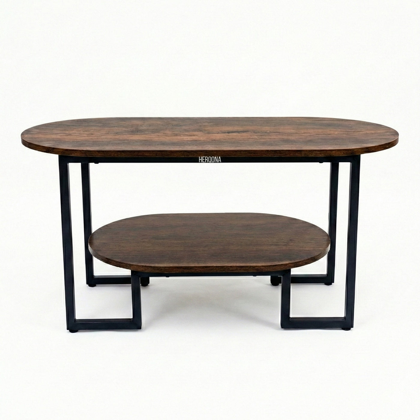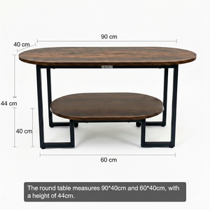 Modern oval coffee table with MDF wood-grain top and metal frame, ideal for living rooms, size 90×40 cm.