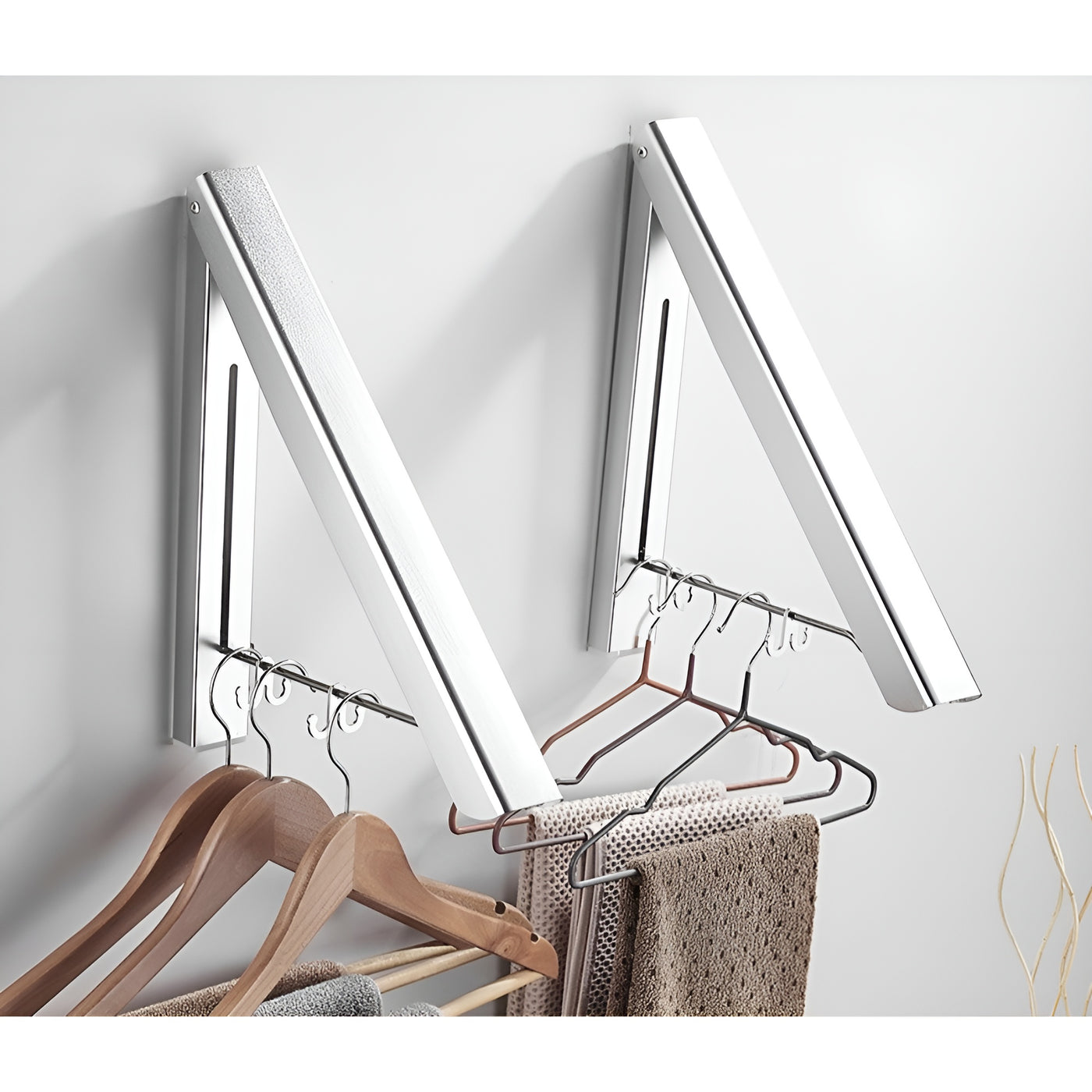 Features:-Foldable Design: Saves wall space when not in use, ideal for small rooms.-Durable Aluminum Alloy: Resists moisture and daily wear for indoor use.-80 cm Hanging Rod: Provides ample space for clothes, jackets, and towels.-Rotating Hooks: Allow flexible hanging and stable support.-Easy to Fold and Store: Convenient for everyday use and storage.