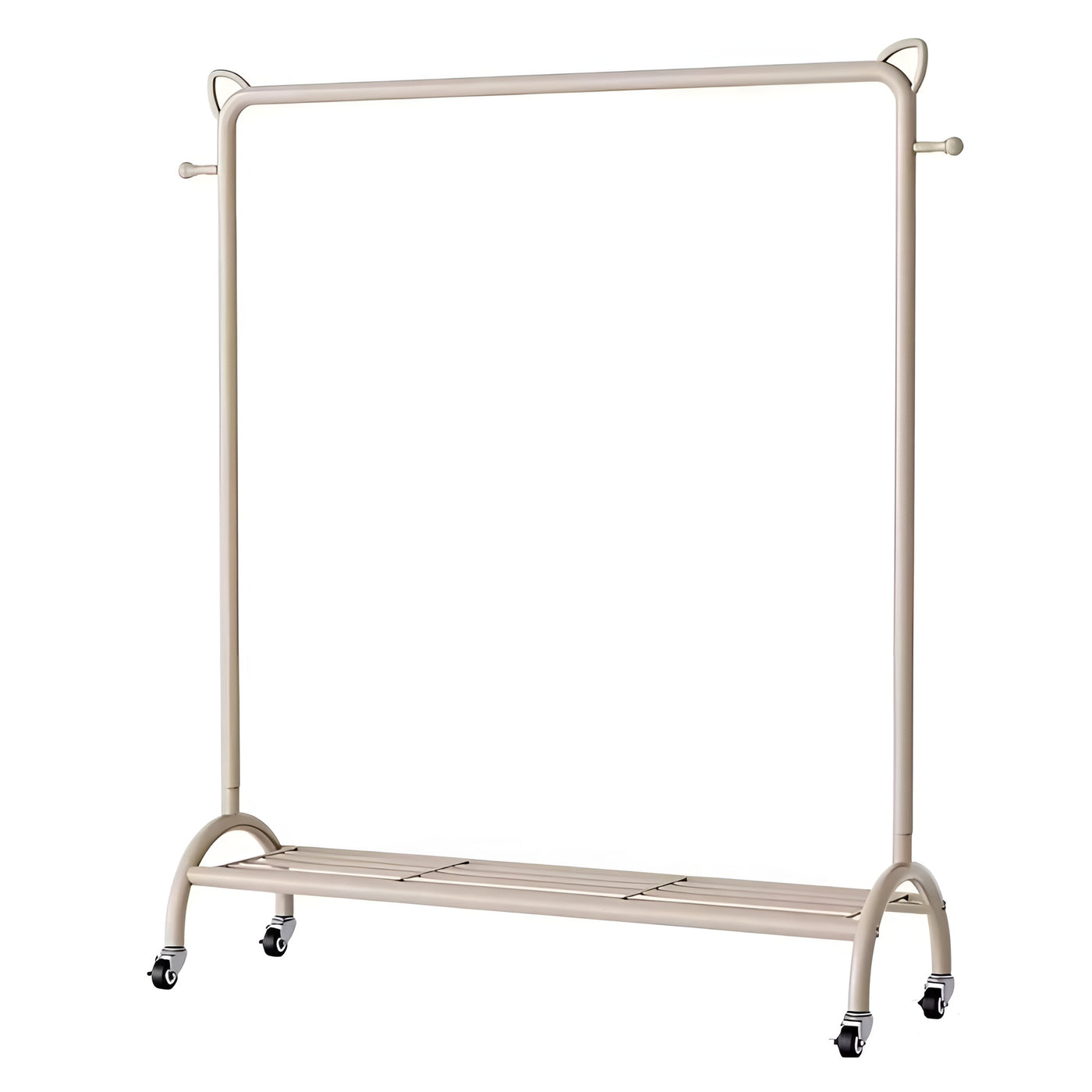 The steel clothes rack provides organized storage for daily wear and accessories. The top rail holds shirts, coats, and longer garments, while the lower shelf stores shoes or boxes. Semi-circular handles on both sides allow easy movement and offer space for hats or bags. Four 360° wheels, including two with brakes, let you move or lock the rack as needed. The steel frame with baked paint finish resists fading and fits neatly in bedrooms, entryways, and laundry areas.