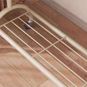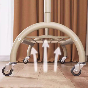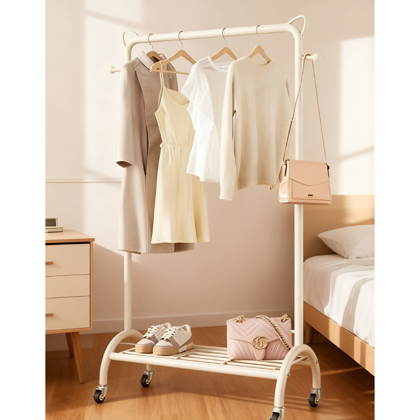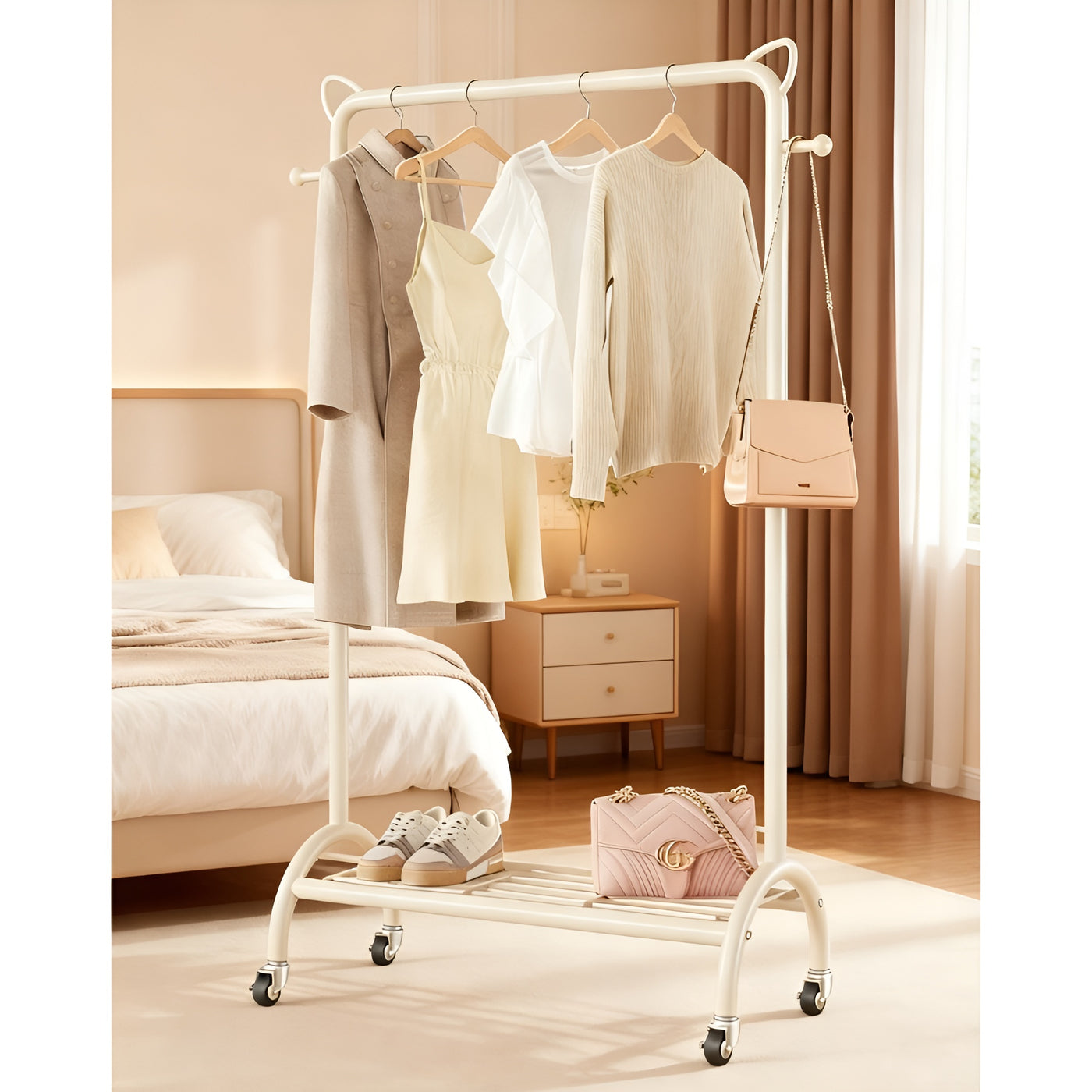 Features:-2 Tier Storage: Top rail for shirts and coats with a lower shelf for shoes or storage boxes to keep clothing organized.-Side Handles: Semi-circular handles support smooth movement and provide a place to hang bags, hats, or scarves.-360° Caster Wheels: Four rotating wheels allow easy repositioning, with two brakes to keep the rack steady.-Steel Frame: Thick steel tubes and a baked paint coating maintain structure and color through daily use.-Compact Placement: Fits bedrooms, hallways, laundry rooms, and balconies without taking up much floor space.