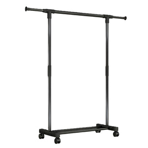 Compact and sturdy clothes rack with adjustable height and smooth-rolling lockable wheels.
