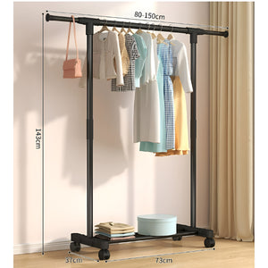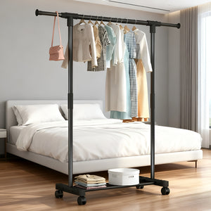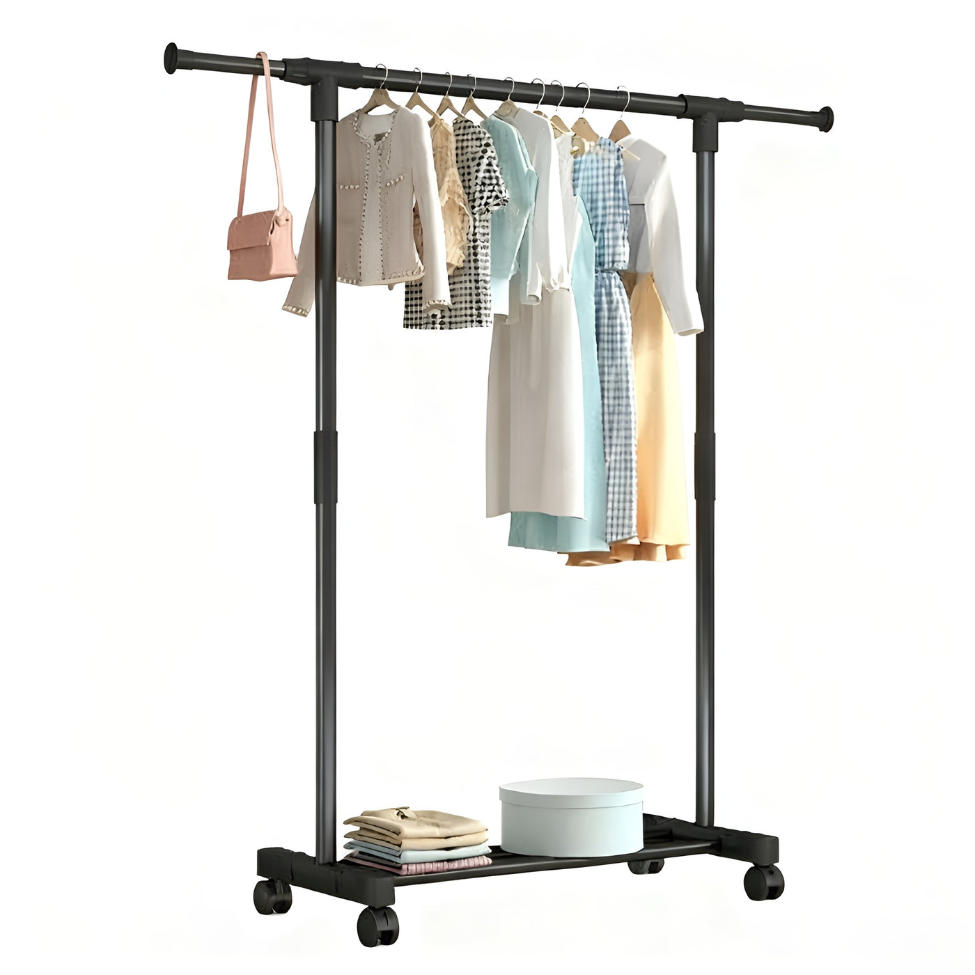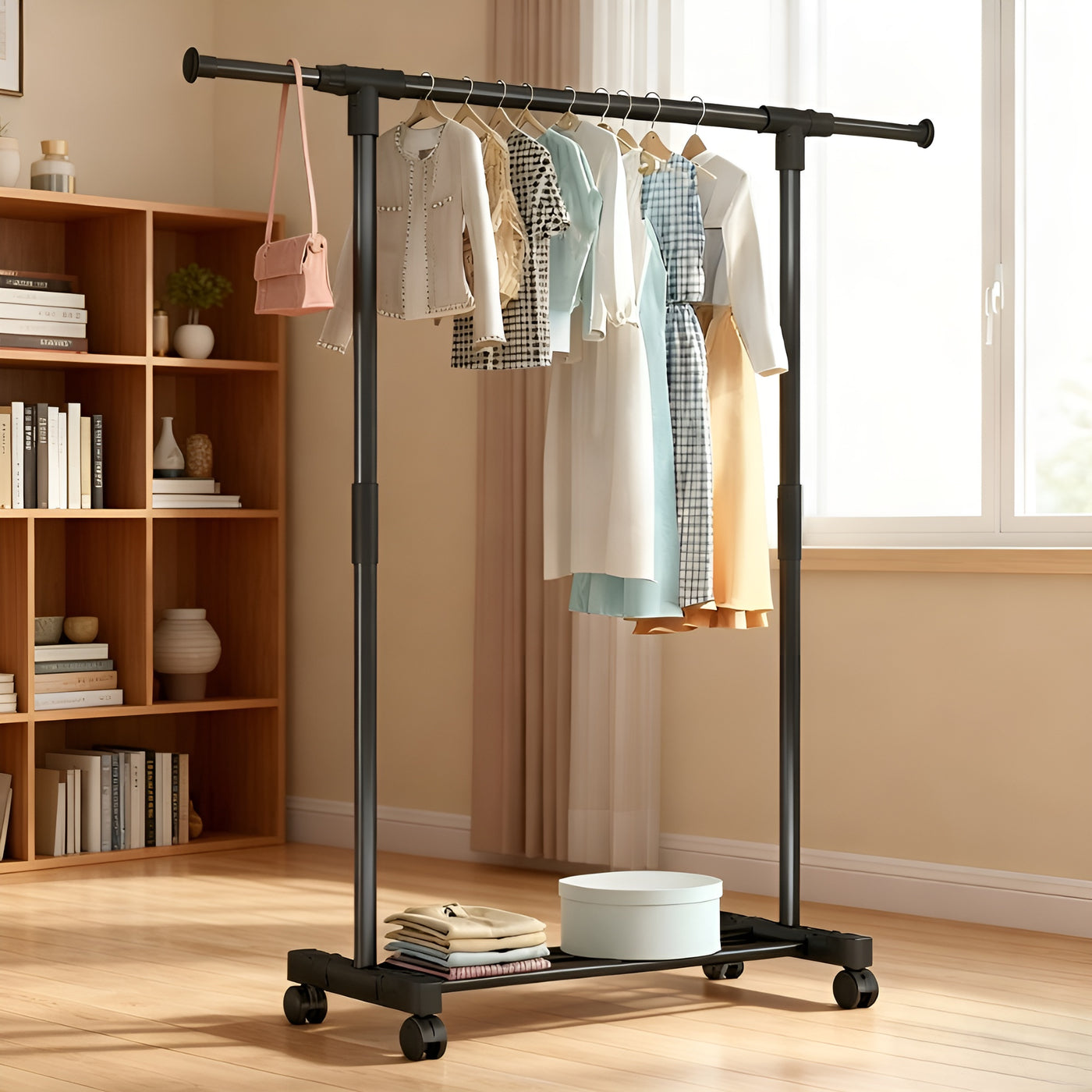 Features:-Adjustable Height: Customizable height to suit various drying or storage needs.-Smooth Mobility: 4 swivel wheels, including 2 lockable ones for secure placement.-Durable Iron Frame: Strong, rust-resistant build for long-term use.-Space Efficient: Ideal for small apartments, laundry rooms, or dorms.-Tool Free Assembly: Quick setup and easy storage when not in use.