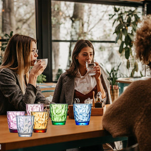 Reusable BPA-free 310 ml plastic tumblers with crystal-like design, stackable and shatter-resistant.Enjoy stylish and practical drinkware with the set of 6 reusable plastic glasses. Each tumbler features a diamond cut pattern with glass-like clarity, offering an elegant touch for family meals, parties, or outdoor gatherings. Made from BPA-free acrylic plastic, the glasses are lightweight, shatter-resistant, and safe for everyday use. Their stackable design saves cabinet space, while the assorted vibrant colors bring a decorative flair to any table. Perfect for serving water, juice, cocktails, or iced coffee at home or on the go.