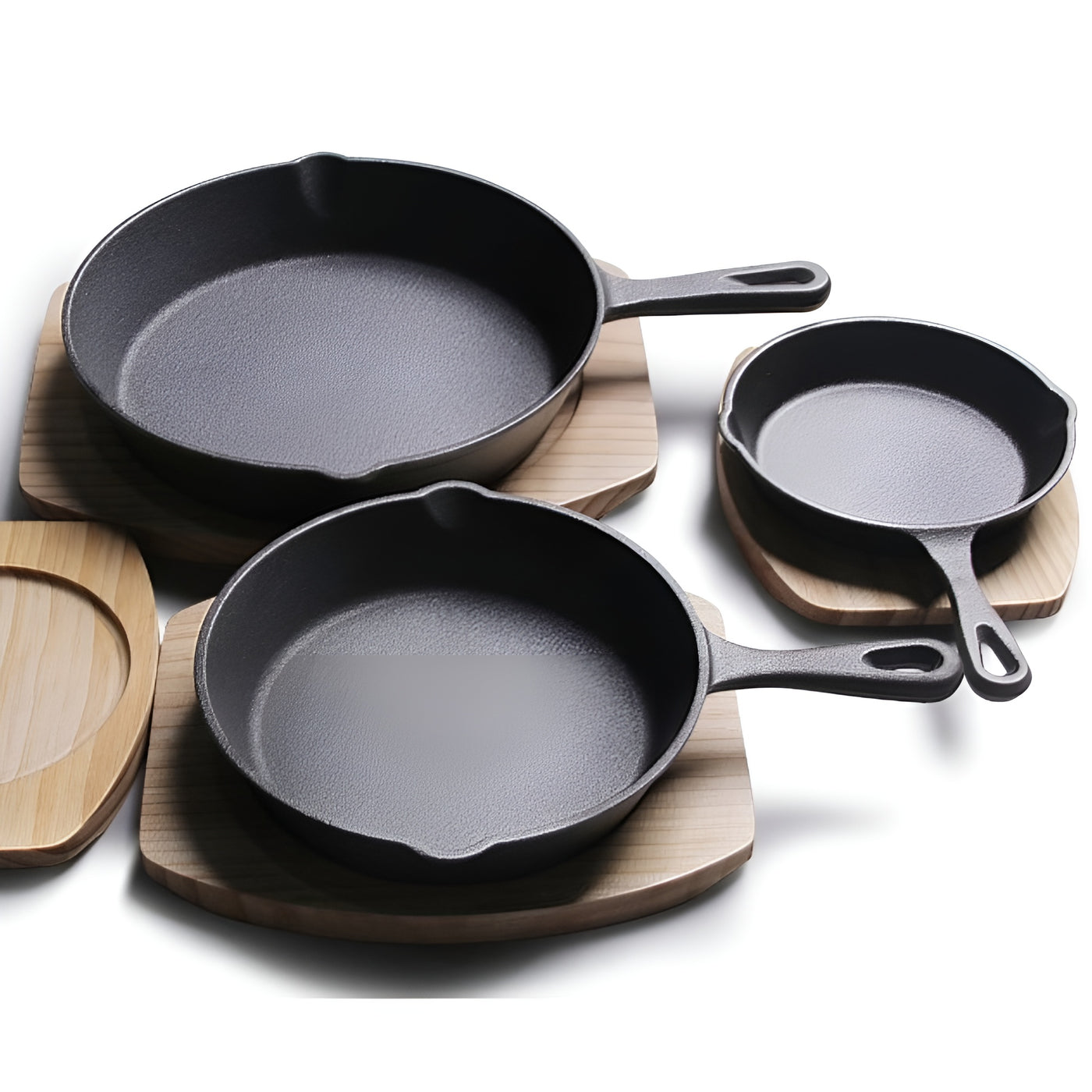 Versatile cast iron cooking set with three pans for frying, searing, baking, and outdoor meals.