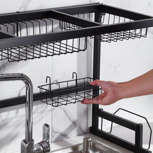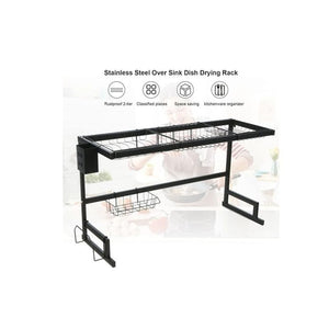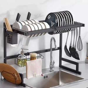 This stainless steel dish drying rack is designed to save kitchen space while keeping your countertop neat and organized. It fits conveniently over your sink, allowing water to drip directly into the basin. With multiple removable holders for dishes, bowls, cutlery, and more, it offers flexibility to arrange items as you like. Its sturdy and assembly is quick with all tools and instructions included.