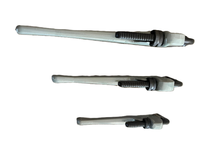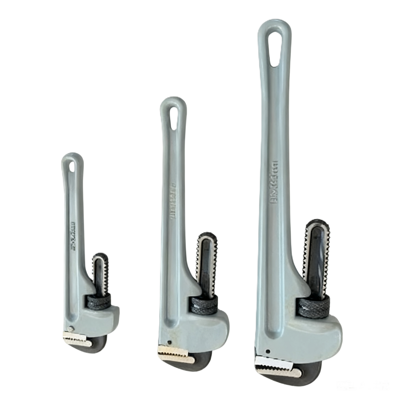 Durable aluminum pipe wrench set for plumbing tasks; sizes 25cm, 35cm, and 45cm for easy use.