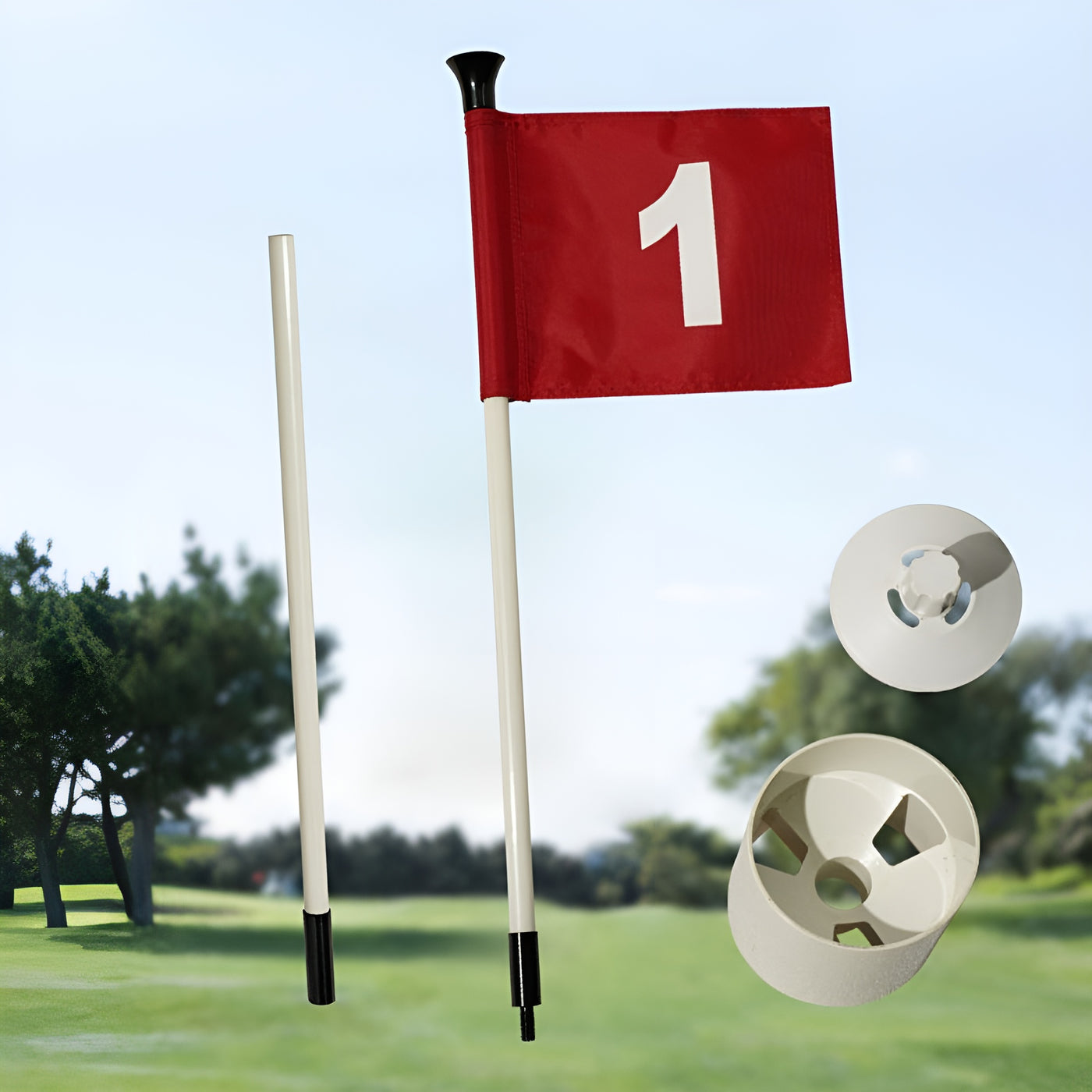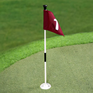 Features:-Flags: 420D nylon stays bright, resists fading, and handles outdoor use without tearing.-Strong Flagsticks: Fiberglass poles offer firm support and stability, with a detachable 2-section design.-Weather Resistant Cups: Cups include three drainage holes to help keep the practice area dry and clean.-Quick Assembly: Lightweight parts connect smoothly for home, yard, and small-green practice sessions.-Portable Design: Easy to pack and move for backyard use or training during travel.