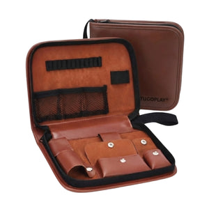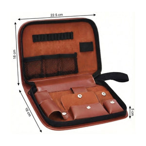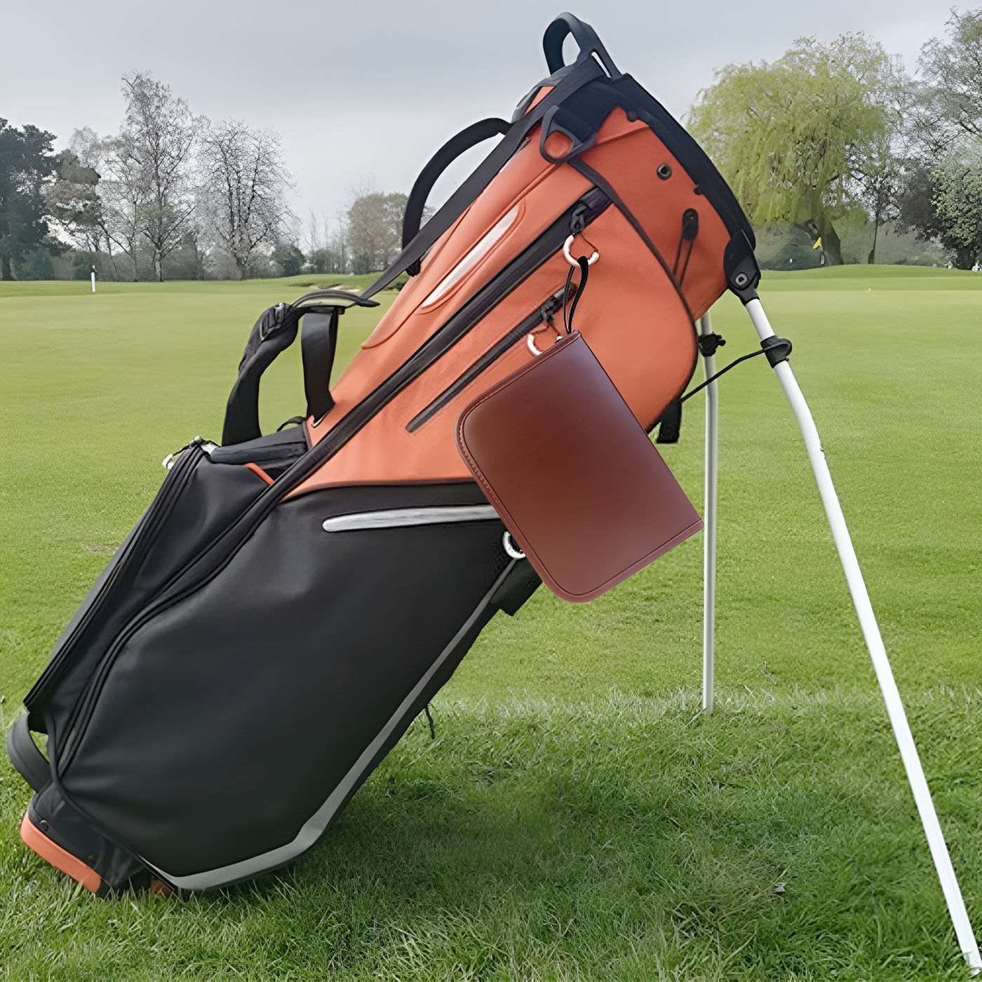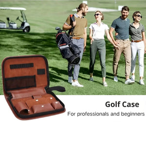 Compact leather golf storage case with organized compartments, zip closure and 22.5×16×5cm size for travel.