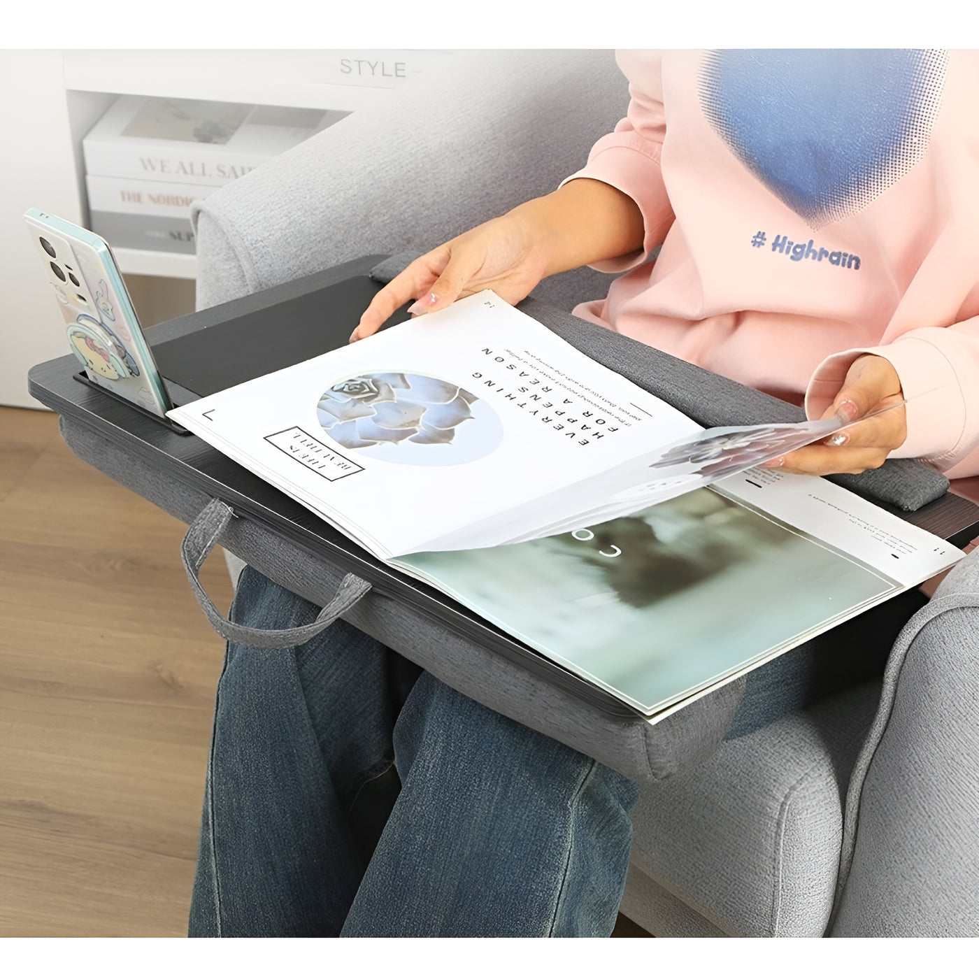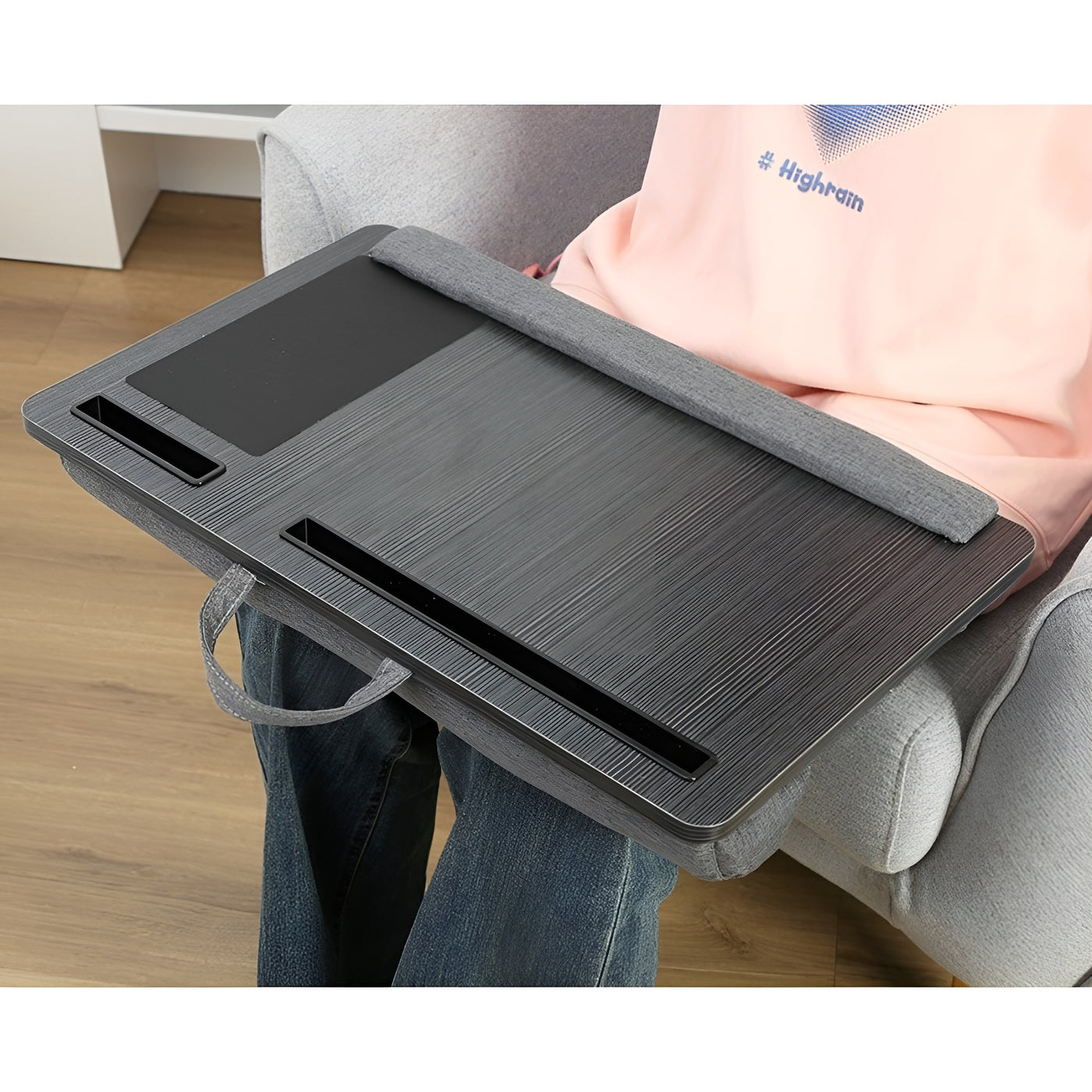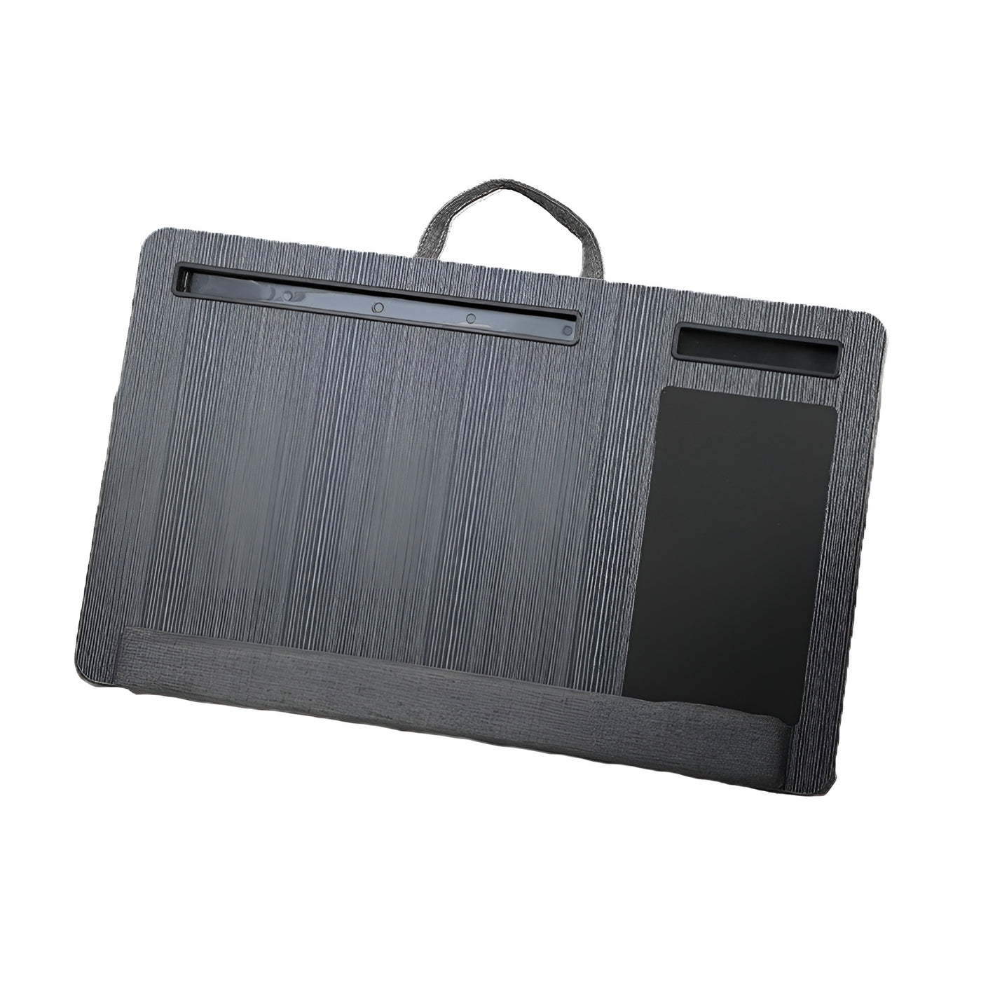 The knee-top lap desk provides a stable surface for laptops, tablets, and books while sitting on a bed, sofa, or chair. Built with a smooth board surface, fabric cushion base, and ABS components, the design offers comfort and steady support. The device slot keeps your phone or tablet in view, and the built-in mouse pad improves control while working. Lightweight and easy to carry, the lap desk is ideal for use at home, in the office, or during study sessions on the go.