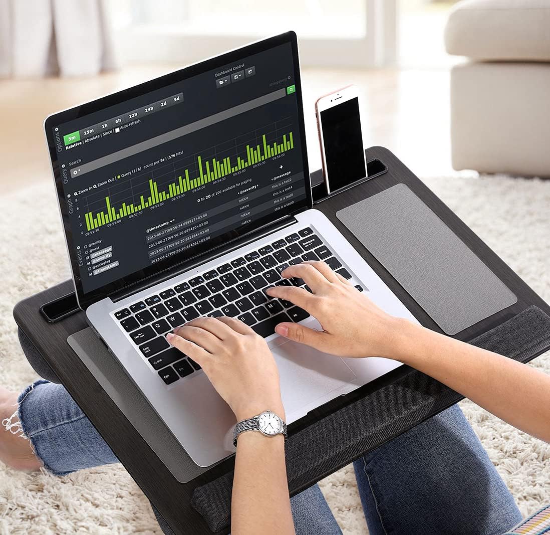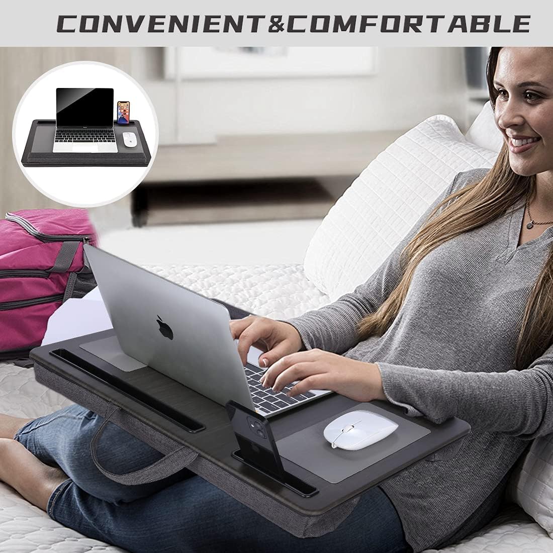 Features:-Multipurpose Use: Works with laptops, tablets, and phones, offering a steady surface for work, reading, study, and browsing.-Cushioned Base: Dual bolster cushions fit your lap and help keep the desk stable during use.-Device Slot: Built-in holder keeps a phone or tablet upright for quick viewing of calls, messages, or videos.-Mouse Pad Surface: Integrated mouse pad improves movement and supports better control while working.-Portable Build: Lightweight design with a carry handle makes storage and travel simple.