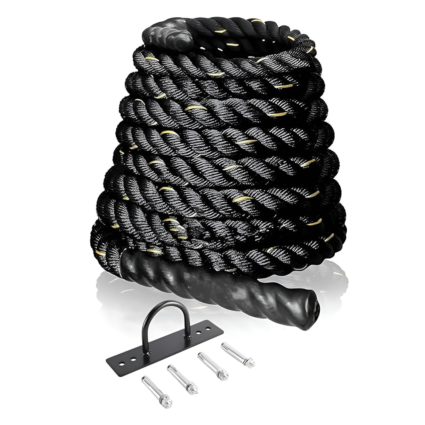 Features:-Full Body Training: Targets arms, shoulders, core, and legs with battle rope drills.-Heavy Duty Polyester: Strong build resists fraying, wear, and outdoor elements.-Secure Grip Handles: Heat-shrink ends protect hands and improve grip.-Portable Design: Rolls up easily for storage or transport.-Versatile Use: Great for waves, slams, pulls, climbs, and more.