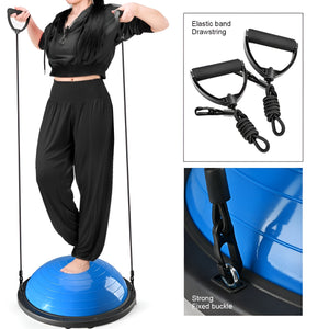 The 58cm balance trainer ball is perfect for home or gym workouts, including push-ups, squats, sit-ups, lunges, and planks. Equipped with six anti-slip rubber feet and detachable resistance bands, it improves stability, balance, and strength. Made from durable, eco-friendly PVC and PP. Lightweight and portable, it includes a foot pump for quick inflation, making it convenient for fitness routines anywhere.