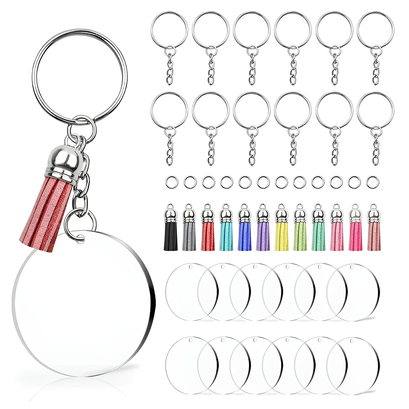 Clear round acrylic blanks (5 cm) with tassels, key rings & open rings for DIY keychains and crafts