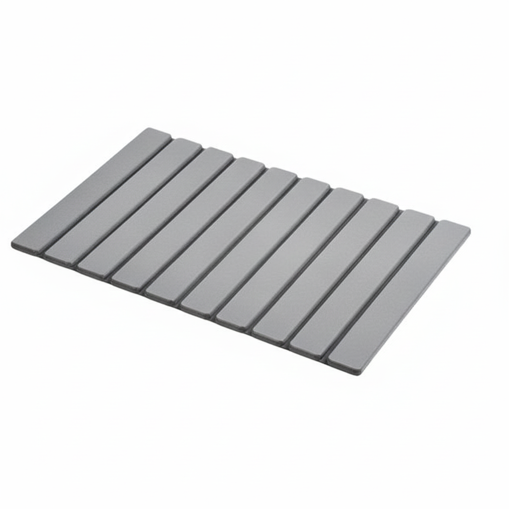 The foldable diatomite bath mat helps keep bathroom floors dry by absorbing water within seconds. The quick-dry surface stays fresh for daily use, and a non-slip backing adds extra safety on wet floors. The smooth design gives bathrooms a neat and clean look, while the foldable style makes storage simple in small spaces. The mat also works under dishes, plants, and pet bowls to help keep home surfaces dry and tidy.