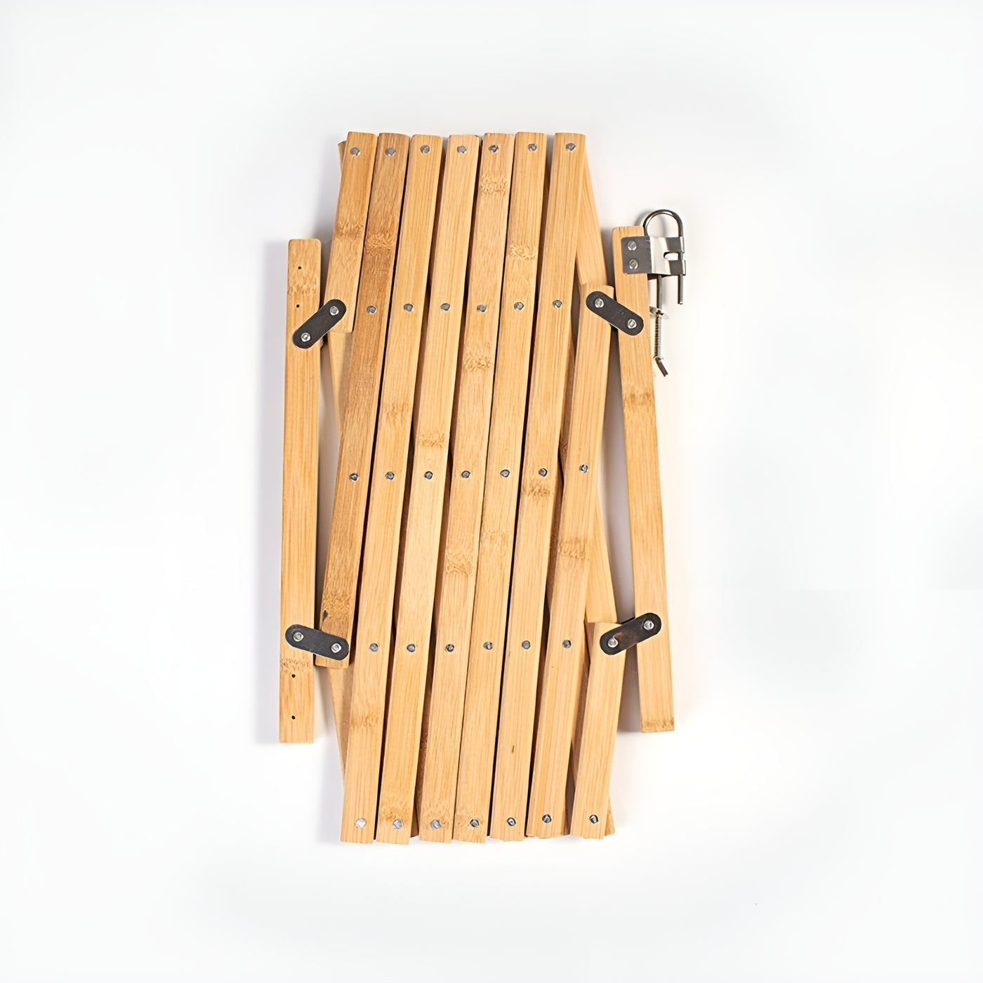 The wooden telescopic pet barrier is designed to create controlled spaces for pets at doorways, halls, and stair entrances. The fence extends to cover wider openings and folds compactly when not in use. Made from sturdy wood, the natural finish blends well with home furniture. Installation is simple, with a screw interface on one side and a buckle on the other. The barrier is easy to move, position, and store in small homes or apartments.