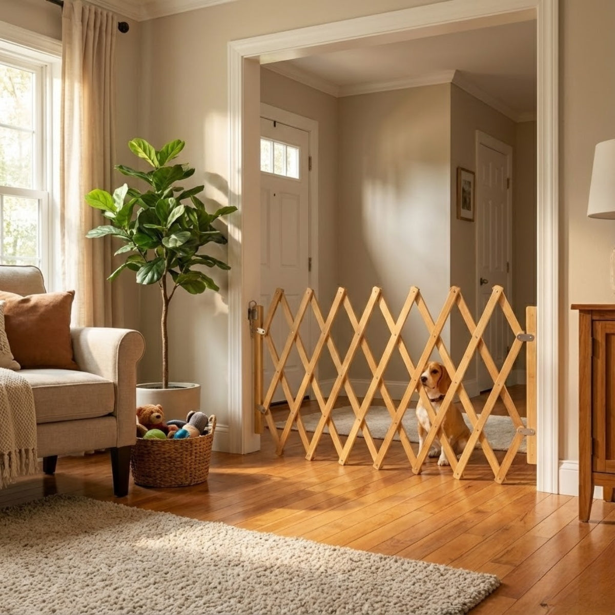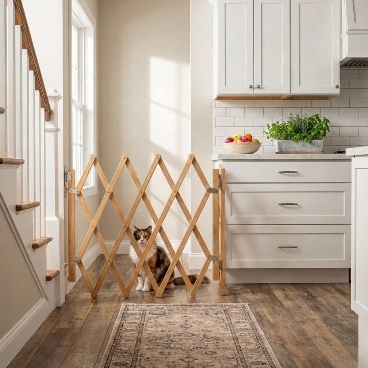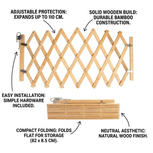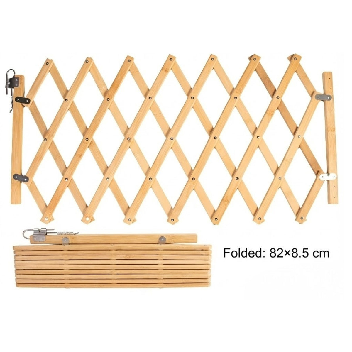 Features:-Adjustable Protection: Telescopic design extends, creating flexible barriers for doors, hallways, or stair entrances.-Solid Wooden Build: Sturdy wood construction provides everyday household use while helping keep pets in safe areas.-Easy Installation: One side mounts with screws, and the other uses a buckle, offering a simple and secure setup.-Compact Folding: Folds to 82×8.5 cm for efficient storage, ideal for apartments, travel, or limited living spaces.-Neutral Aesthetic: Natural wood color blends with most home furniture and decor for a clean and seamless appearance.